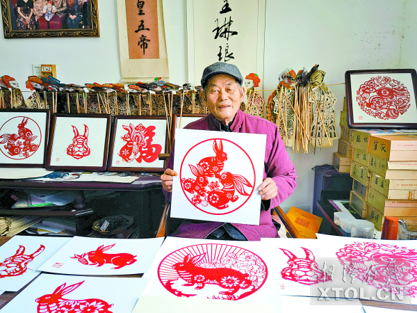 图为吴升平老人展示他的生肖兔剪纸作品。图片来源:365bet官网提现说维护_be365官网_365bet提款时间日报社全媒体记者 陈旭东 摄