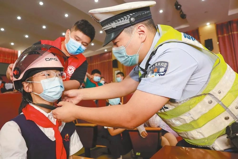 5月24日,在合肥庐阳经济开发区南小恒盛皇家花园校区,交警在为小学生普及“一盔一带”交通安全知识,培养孩子们文明出行好习惯。(通讯员 赵明 摄)