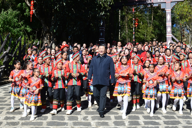 1月19日至21日,中共中央总书记、国家主席、中央军委主席习近平来到云南,看望慰问各族干部群众,向全国人民致以新春祝福。这是19日下午,腾冲市清水乡三家村中寨司莫拉佤族村的乡亲们唱着《阿佤人民唱新歌》,簇拥着习近平走出村口。新华社记者 谢环驰 摄